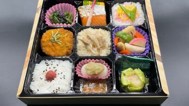 旅行代理店様向け 越後懐石弁当 1,200円(税込1,296円)新潟の食材を煮物・焼き物・揚げ物と余すことなく和風にしつらえたお弁当です。W21 × D21 × H4(cm) 2024.01.27 旅行代理店様向け